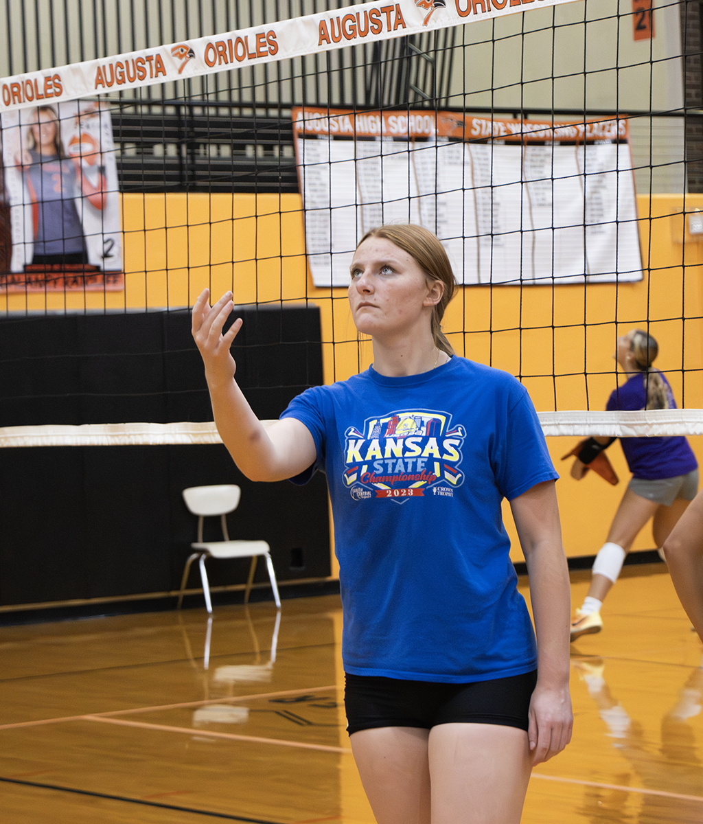 During a passing drill, senior Molly Marteney works on short passes. She tried to keep it on her side of the net.