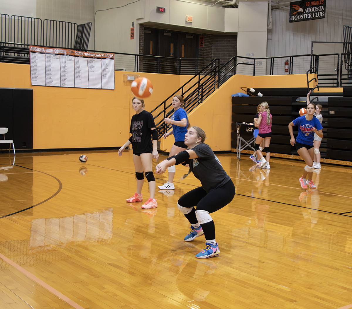 The volleyball team listens to head coach Lexi Hogan explain a new drill. One of the main skills the team worked on was passing to the setter.